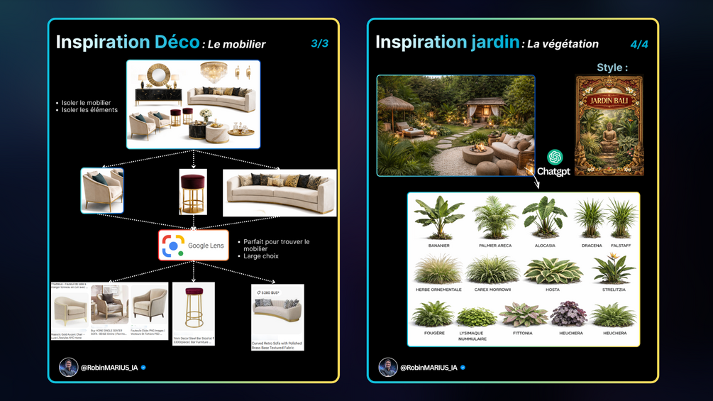 ✅Passez du virtuel au réel : Ne vendez pas du rêve impossible. Utilisez notre workflow unique pour "isoler" les meubles générés par l'IA et retrouver les produits réels (ou équivalents) disponibles à l'achat via Google Lens.